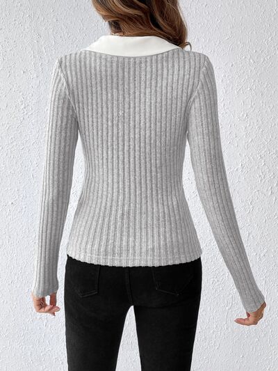 Ribbed Contrast Johnny Collar Long Sleeve Blouse